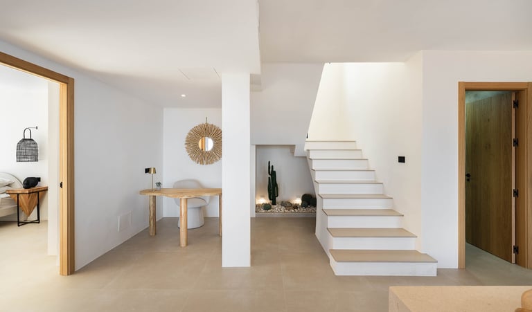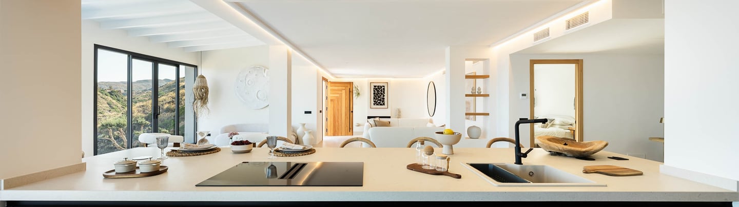 The main level integrates the entrance hall and living areas into an open-plan space conceived for daily life, conversation and relaxation. The fully equipped kitchen is designed for real use and long stays, not merely for display..