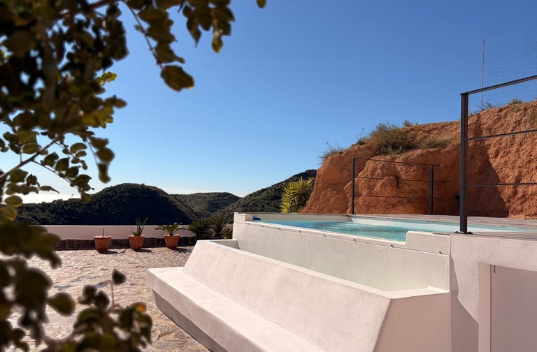 The property features multiple terraces distributed throughout the estate, designed to enjoy every moment of the day, as well as an outdoor swimming pool integrated into the landscape and a covered double garage.